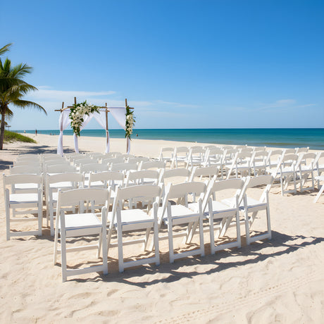 Elegant resin folding chairs for weddings and events, combining durability, comfort, and timeless style. |